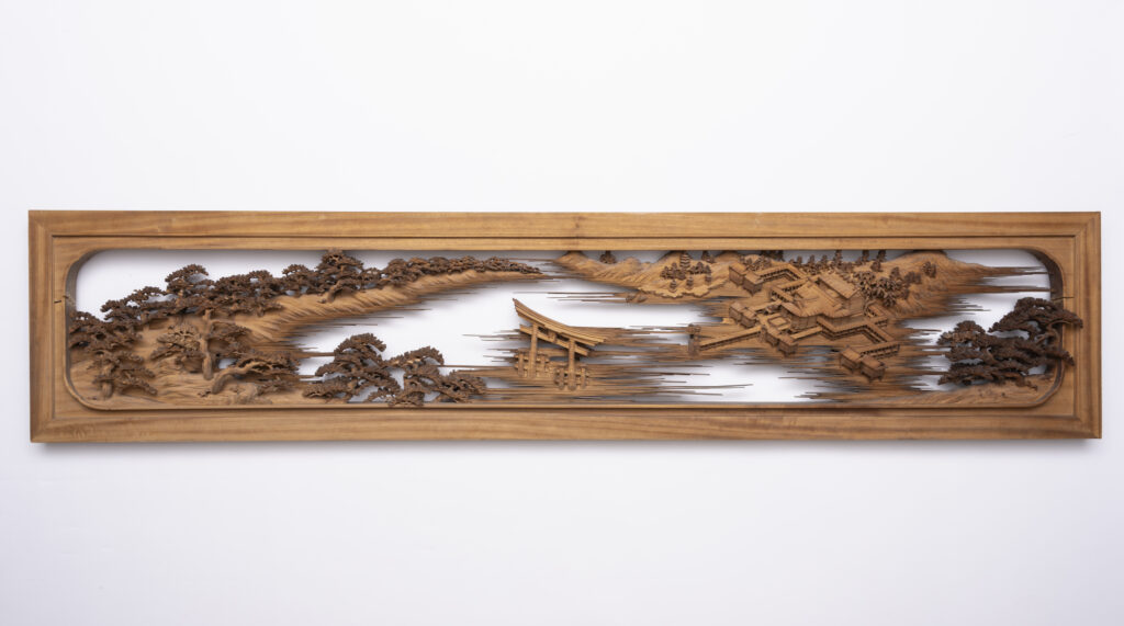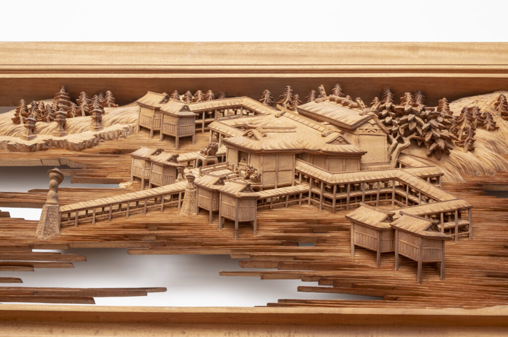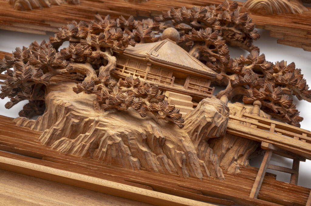 江戸時代後期、井波彫刻の職人たちは主に神社やお寺の彫刻を手がけ、お互いに技術を競い合うようになりました。明治時代後期ごろになると、社寺だけでなく一般の家(民家)でも欄間に美しい彫刻をほどこすようになり、これが「井波欄間」として確立され、戦後の高度成長期とともに人気を集めます。