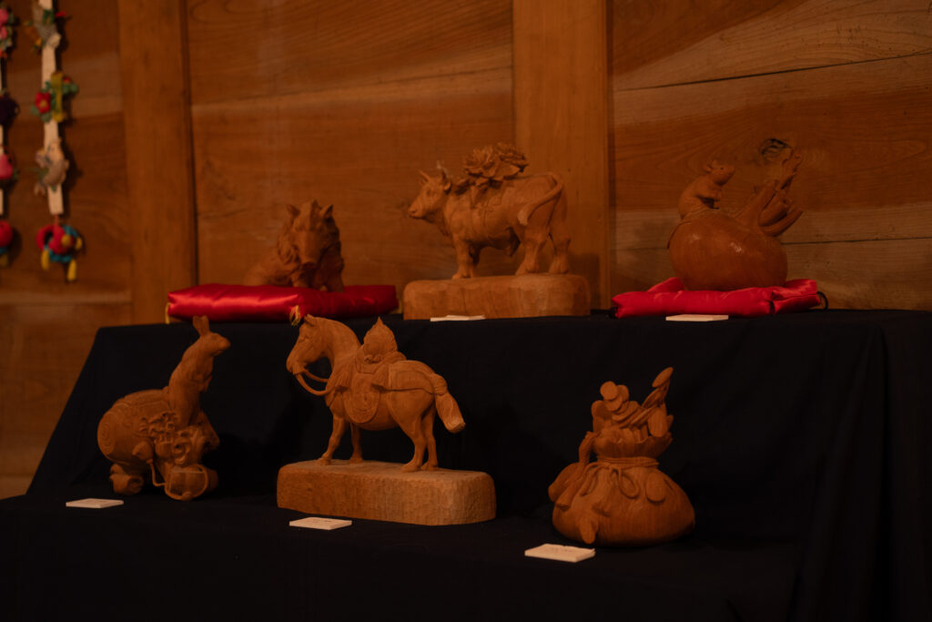 昭和に入ると東本願寺(京都)、築地本願寺(東京)など、全国の有名な寺や神社の彫刻を数多く手がけました。それと並行して一般の家の欄間、獅子頭(お祭りの飾り)、置物なども作り、幅広い分野で技術を生かしていきました。