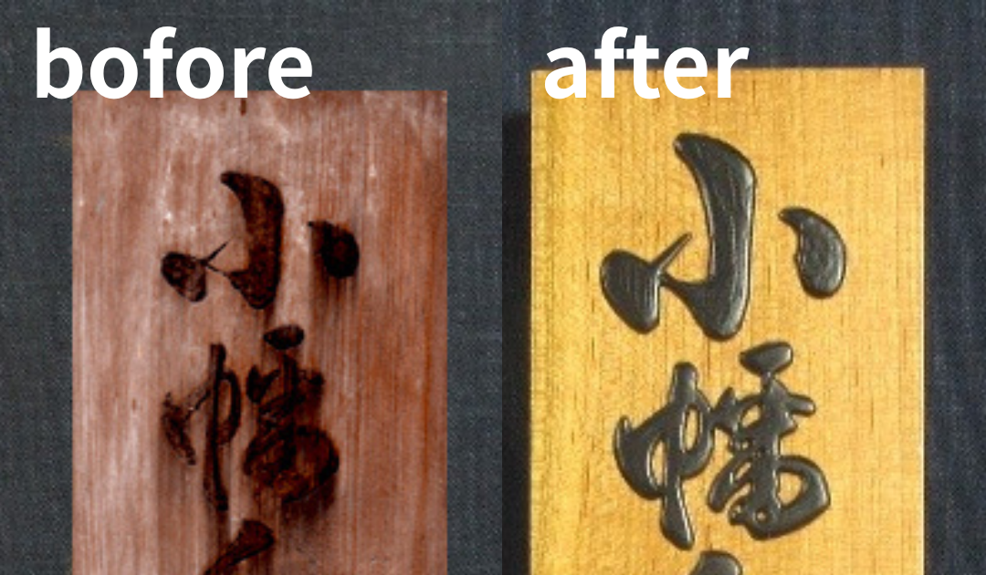 木は削ればきれいな表面が出てくるので、黒ずんだ表面をカンナで削り、そこに文字を彫り込むと、新品のようになります。